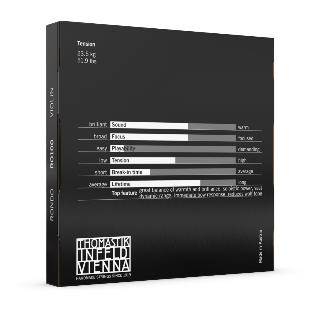 Professional musicians and soloists appreciate the RONDO® Violin strings’ unique tonal intensity and vast dynamic range with a reliable response. These strings tonally enrich old and modern instruments with an intense depth, brilliant contour, and sweetness – sound qualities mostly associated with old Italian instruments. Another particular essence of the RONDO® Violin strings is its impressive and strong focus that adds an inner tonal density to its focal point of sound. The strings’ immediate bow response further supports this focus on all dynamic levels at various bowing speeds, bow pressures, and contact points. The RONDO® Violin strings combine all these attributes to a deep singing sound quality with a beautifully refined and mature vocal character. This leads to a powerful presence, giving the player confidence when projection and volume need to be easily delivered.
